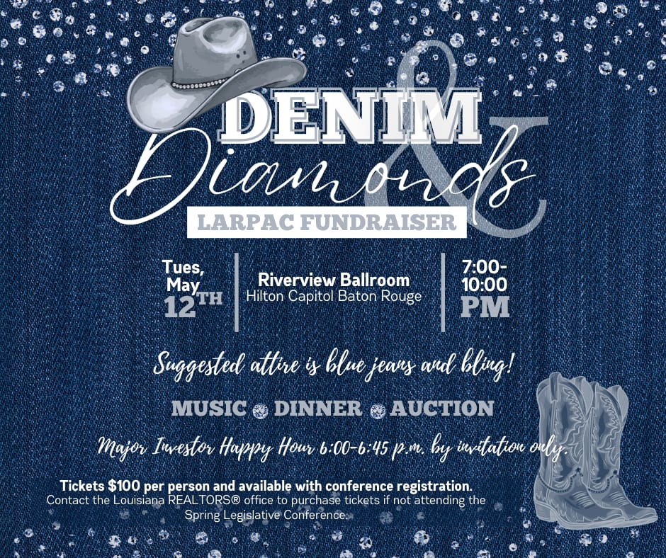 Join the Spring Into Action Legislative Conference early with an unforgettable evening at the LARPAC Denim & Diamonds Fundraiser on Tuesday, May 12, from 7:00–10:00 p.m. at the Hilton Baton Rouge Capitol Center. This fun and energetic event brings REALTORS® together for a night of networking, entertainment, and advocacy in support of the REALTOR® Political Action Committee (LARPAC). Guests can enjoy music, live and silent auctions and plenty of opportunities to connect with colleagues from across the state. Throw on your best denim and a little sparkle and join us for a great cause. Every ticket helps support LARPAC’s efforts to elect and support leaders who champion policies that protect property rights and promote a strong real estate industry in Louisiana. Tickets are $100/person and are additional to your conference registration, so be sure to add this can’t-miss event to your conference plans. Major Investors will receive a separate invitation to attend a MI Happy Hour before the event. Tickets for fundraiser can be purchased during conference registration process. If not attending the conference, please contact the LR office for separate ticket purchase. Louisiana REALTORS® Political Action Committee Contributions are used for political purposes, are voluntary, & are not deductible for Federal income tax purposes. Any amounts indicated are merely guidelines & you may contribute more or less than the suggested amounts. Neither your membership nor your participation in Louisiana REALTORS® is conditioned directly or indirectly on contributing to LARPAC. You may refuse to contribute without reprisal. The following is sent to the National REALTORS® Political Action Committee (RPAC) to support federal candidates and is charged against your limits under 52 U.S. C. 30116: (1) 30% of all contributions of $1,000 or more made at any time; & (2) 30% of each contribution less than $1,000 until LARPAC meets its Federal Allocation Goal set by RPAC. LARPAC retains the following to support state and local issues & candidates: (1) 70% of contributions that are $1,000 or more; & (2) 100% of contributions of less than $1,000 after the RPAC Federal Allocation Goal is met.